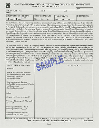 L’intervista semistrutturata SCICA per bambini e adolescenti (Semistructured Clinical Interview for Children & Adolescents) è stata costruita per guidare con domande dirette e specifiche la valutazione clinica di bambini e adolescenti di età compresa fra i 6 e i 18 anni. L’intervista offre una cornice generale ed esemplificativa delle principali aree da indagare attraverso il colloquio clinico con il bambino.
